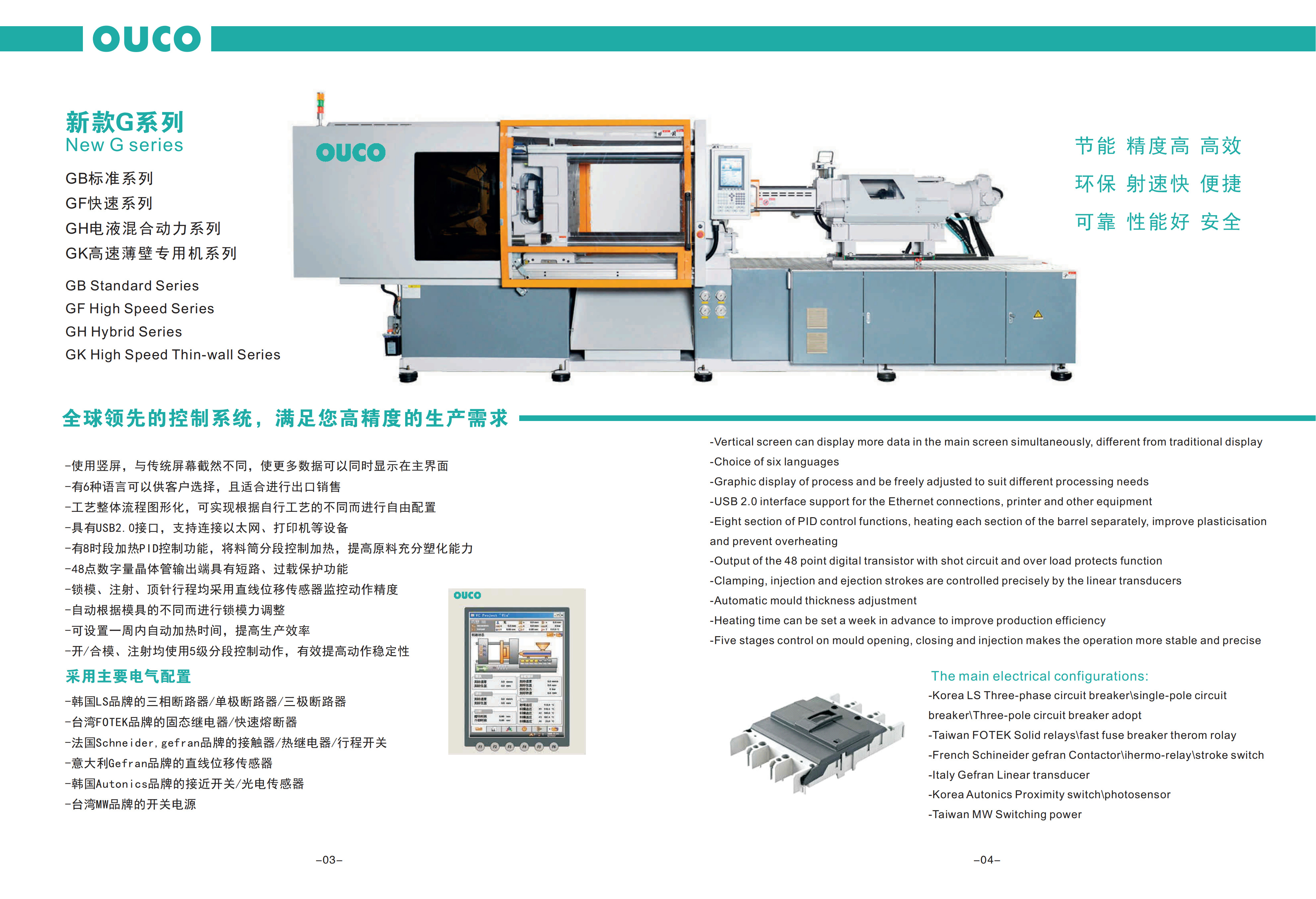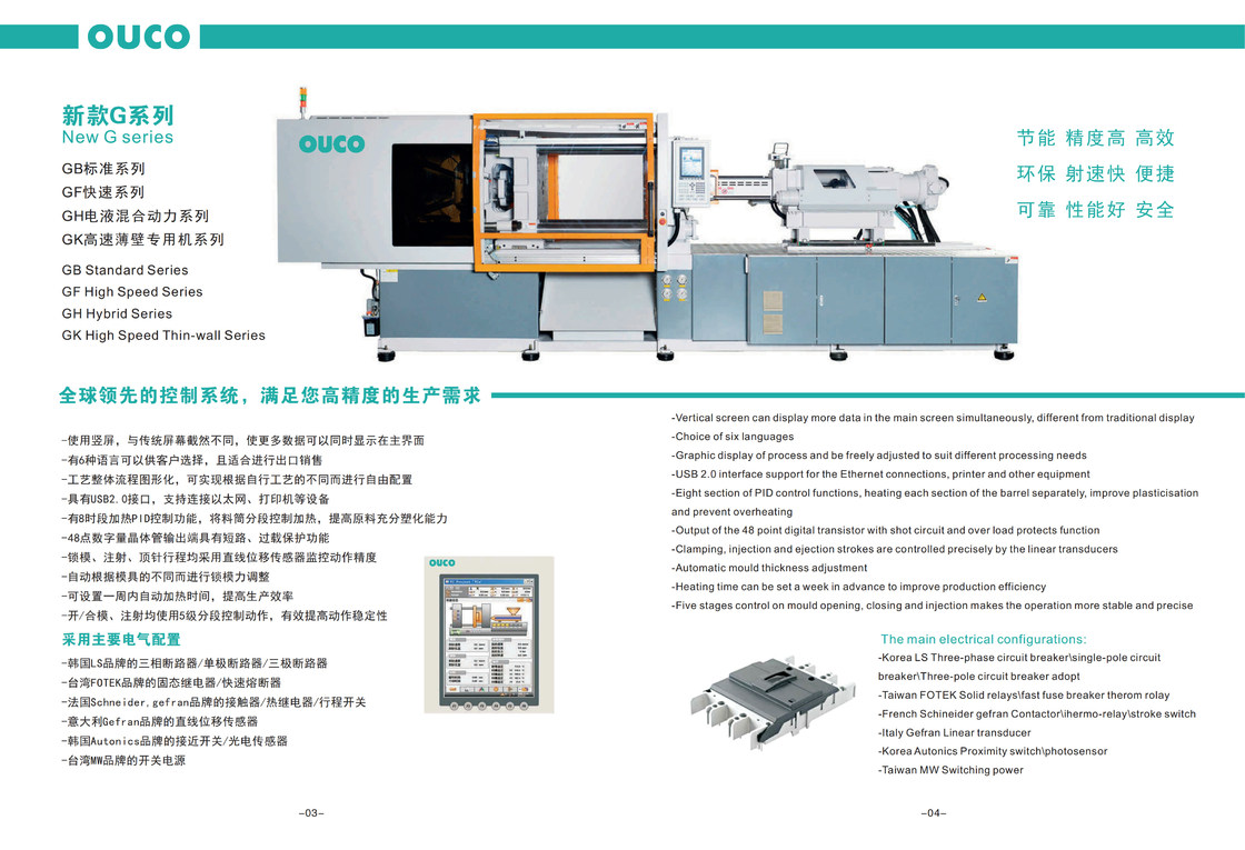 OUCO создает новый продукт G-серий с европейскими стандартами. Система сервопривода SV энергосберегающая имеет 8 спецификаций с зажимать силу выстраивая в ряд от 110 тонн до 600 тонн. Каждую спецификацию можно также выбрать с 2 или 3 различными структурами впрыски согласно требованиям к продукта клиента.